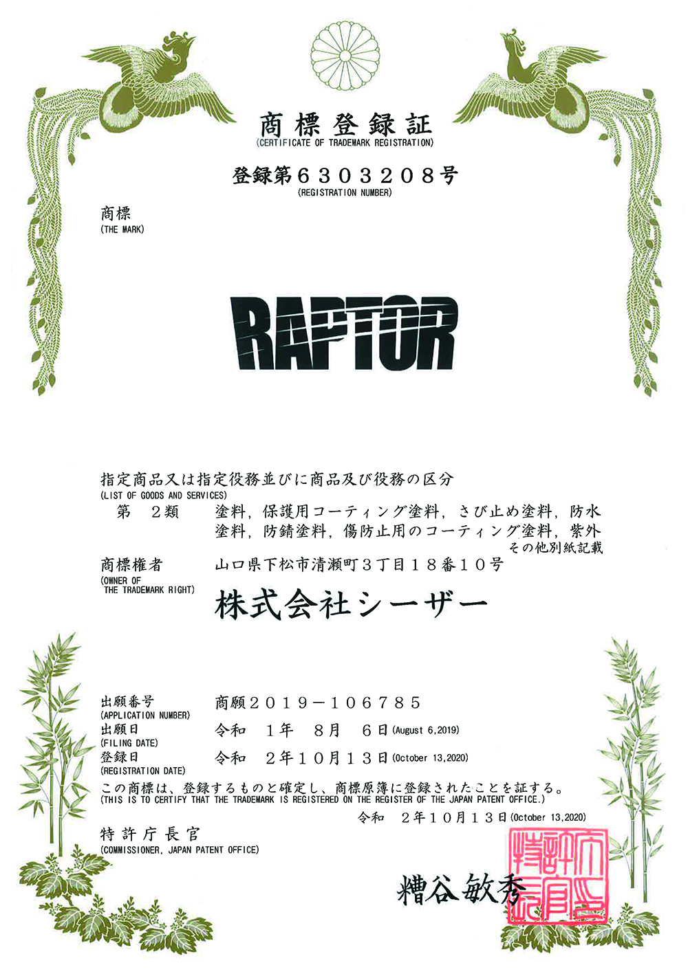 | 令和2年10月 | 英国U-POL社「RAPTOR」を日本で商標登録![]() |